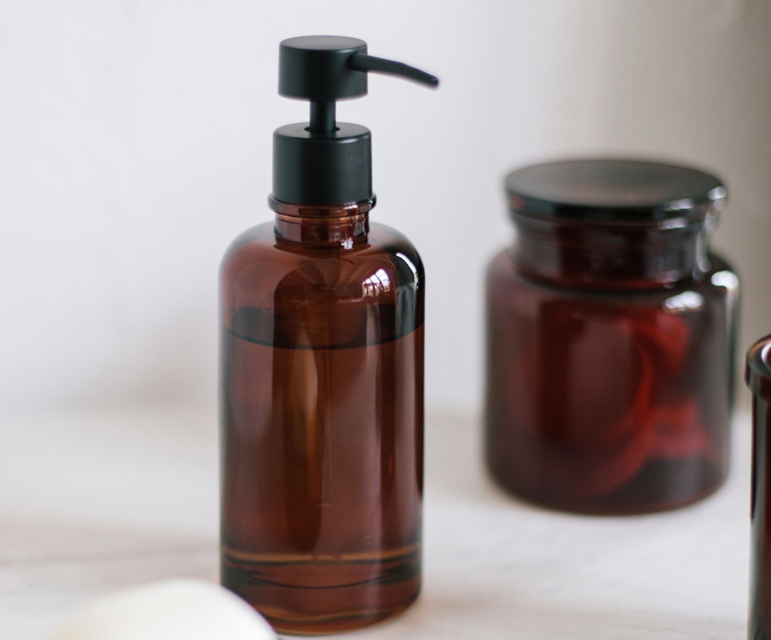 Dispenser in vetro in stile farmacia retrò, unisce il vetro rossastro marrone con il dispenser in poliresina nera.