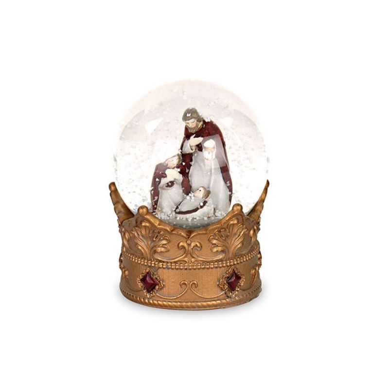 Raffinata palla di neve natalizia con all’interno una scena della Natività, realizzata con cura nei dettagli e impreziosita da una base dorata a forma di corona, decorata con motivi in rilievo e gemme rosse.
