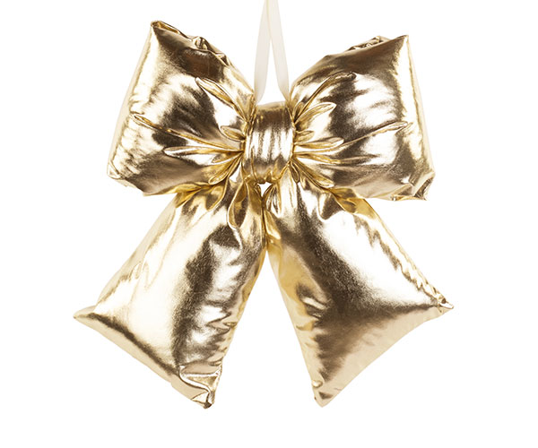 Raffinato fiocco decorativo color oro con finitura lucida, ideale per impreziosire alberi di Natale, ghirlande, porte, vetrine o pacchi regalo.