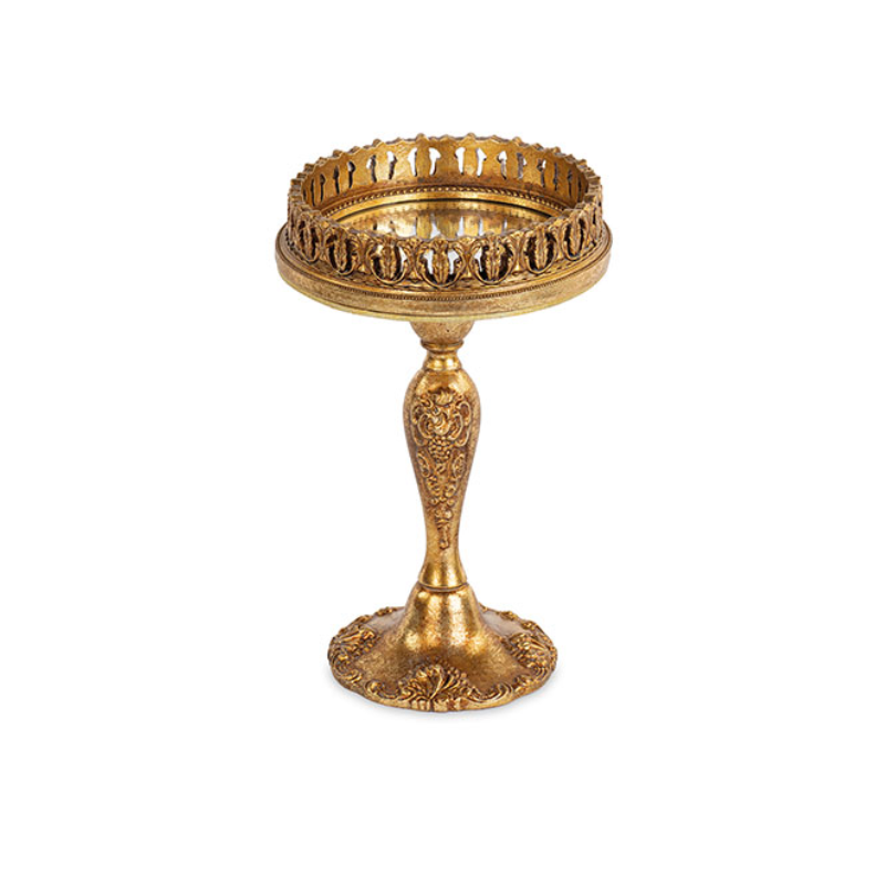 Elegante portacandele su piede alto in poliresina dorata, decorato con motivi barocchi e piattino a specchio che riflette la luce della candela, creando un effetto luminoso e raffinato.